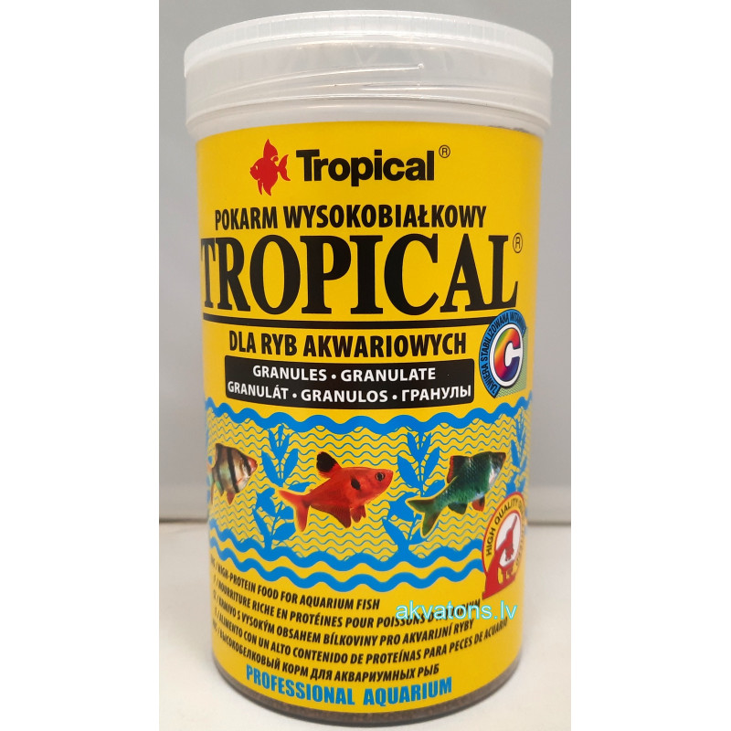 Tropical Granulat ir granulēta bariba ar augstu olbaltumvielu daudzumu. Paredzēts visēdāju un gaļēdāju zivju ikdienas barošanai. Regulāri lietojot, tas nodrošina efektīvu ķermeņa svara pieaugumu un nodrošina nepieciešamos vitamīnus, kā arī mikro un makro elementus. Īpaši ieteicama lielo zivju sugu nārstotāju un mazuļu barošanai, ko nodrošina ar vērtīgām augu un dzīvnieku izcelsmes olbaltumvielām, kas bagātas ar ārkārtīgi svarīgām eksogēnām aminoskābēm. Grimstošās granulas sasniedz arī apakšējo zonu, kur tās var savākt ar kiriem un citām mazām summām. Tropical Granulāta augstā uzturvērtība ļauj to lietot atveseļošanās periodā, kad zivīm nepieciešama īpaša kopšana un kalorijām bagāta, viegli sagremojama, vitamīniem un mikroelementiem bagāta barība. Uzmanība tiek vērsta uz augsto stabilizētā C vitamīna saturu, kas, cita starpā, paaugstina zivju izturību pret slimībām, paātrina brūču un nobrāzumu dzīšanu, kā arī spēlē nozīmīgu lomu zivju mazuļu attīstībā, novēršot skeleta deformācijas. .