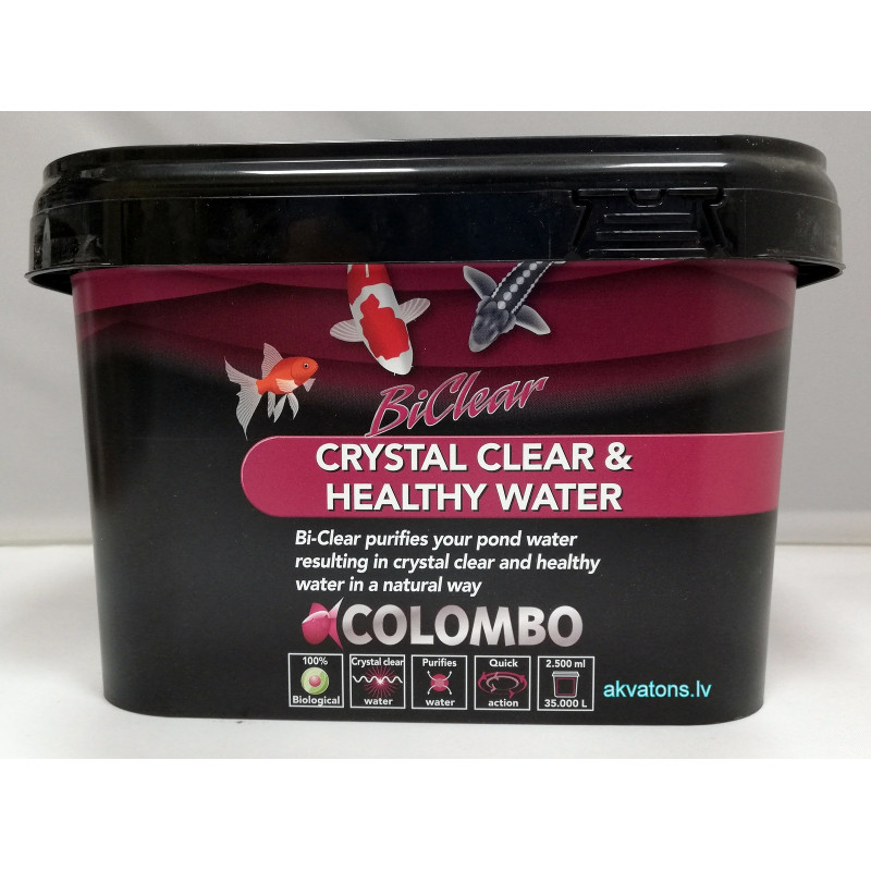 Colombo BiClear apvieno divas dabiskas sastāvdaļas, kas kopā nodrošina kristāldzidru un veselīgu ūdeni dīķī. Pirmais komponents darbojas kā suspendētais filtrējošais materiāls un tieši absorbē organiskos piesārņotājus un toksiskās vielas. Otrais komponents papildina dabiskās minerālvielas, kas ir svarīgas zivīm un augiem. Šīs divas sastāvdaļas pastiprina viena otru, tāpēc BiClear ir ļoti efektīvs, piemēram, duļķaina ūdens gadījumā. Regulāra lietošana nodrošina veselīgu un kristāldzidru ūdeni.