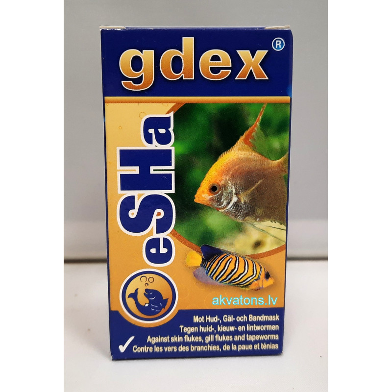 eSHa gdex lieliski kontrolē tādas sugas kā plakanie tārpi/ādas putraimi (Gyrodactylus), žaunu tārpi (Dactylogyrus) un lenteņi (Cestoda), vienlaikus to labi panes dažādi augi, garneles un filtru baktērijas. Apvienojiet to ar eSHa HEXAMITA, un jums ir visaptveroša slimību kontroles sistēma cichlidiem un diskiem, tostarp tiem, kas ievesti no savvaļas.