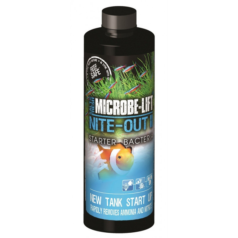 Speciāli izstrādāts ātrās amonjaka un nitrīta samazināšanai. Samazina amonjaka un nitrītu toksicitāti, apstrādā līdz 27 L. MICROBE-LIFT / Nite-Out II ir īpaši izstrādāts akvārija ūdeņiem, kas satur jūras dzīvību. Tās augsti specializētais nitrējošo kultūru mikroorganismu konsorcijs ir speciāli izstrādāts, lai iznīcinātu amonjaku, izmantojot dabisko bioloģisko procesu, ko sauc par nitrifikāciju. MICROBE-LIFT / Nite-Out II sastāvā esošās kultūras izveidos, veicinās vai stabilizēs un uztur nitrifikāciju akvārija ūdeņos, novēršot amonjaka toksisko iedarbību. MICROBE-LIFT / Nite-Out II šķidrās nitrifikācijas baktērijas satur izvēlētus Nitrosomonas, Nitrospira un Nitrobacter celmus. Nitrosomons oksidē amonjaku līdz nitrītam un Nitrobacter un Nitrospira oksidē nitrītu līdz nitrātiem. Nitrifikācija Nitrosomonas Nitrobacter NH3 => NO2 => NO3 Amonjaka nitrīta nitrāts MICROBE-LIFT / Nite-Out II ietver mikroorganismu izvēli, kuri ir autotrofiski un var izmantot oglekļa dioksīdu kā vienīgo oglekļa avotu, un tie ir salīdzinoši lēni augoši, un tiem nepieciešami īpaši apstākļi optimālai augšanai ar tipisku šūnu dalījumu, no 8 līdz 16 stundām. To veiktspēju un ātruma pieaugumu ietekmē vides parametri, kas nepieciešami nitrifikācijai. Brīdinājumi Uzglabāt bērniem nepieejamā vietā. Pēc lietošanas izmazgājiet rokas. Ja parādās acu kairinājums, skalot ar ūdeni 15 minūtes. Nelietojiet iekšķīgi. PIEZĪME. Derīguma termiņš ir 18 mēneši. NEDRĪKIET. Uzglabāt istabas temperatūrā. Izvairieties no saules gaismas. Atdzesējiet 4 C - 7 C pēc atvēršanas, lai pagarinātu uzglabāšanas laiku.